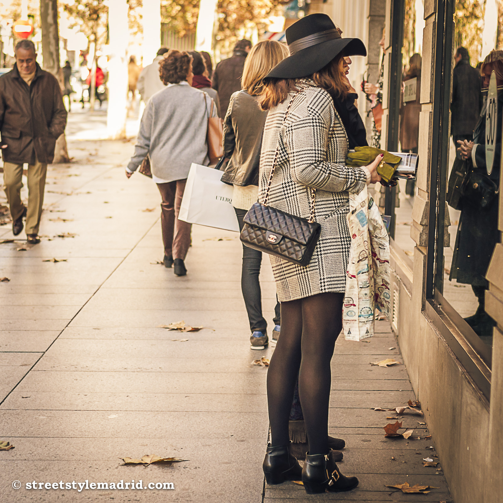 Bolso 2.55 de Chanel, Cuadros, Medias, Negro, Principe de Gales, Sombrero de ala ancha