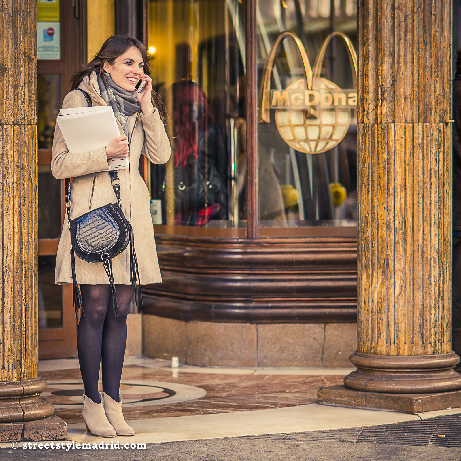 Abrigo camel, Bolso negro, botines marrones, Bufanda, Madrid, Medias, Street Style, streetstylemadrid